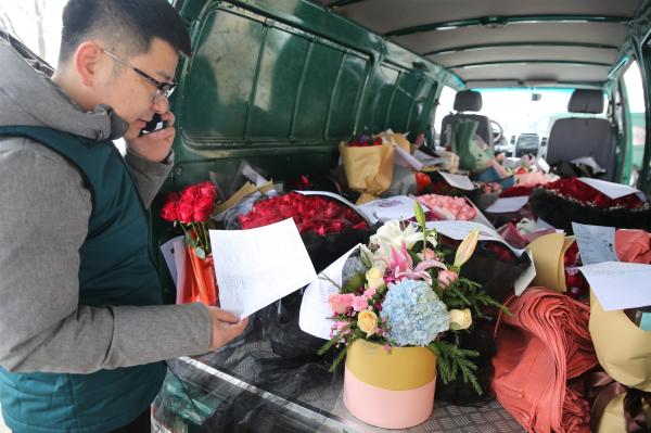 2月14日情人节,青岛的商家纷纷推出各式鲜花供消费者选购,青岛开发区分公司紧抓节日商机,组织投递员参与鲜花配送,一天时间,该分公司完成近千个订单的配送。
