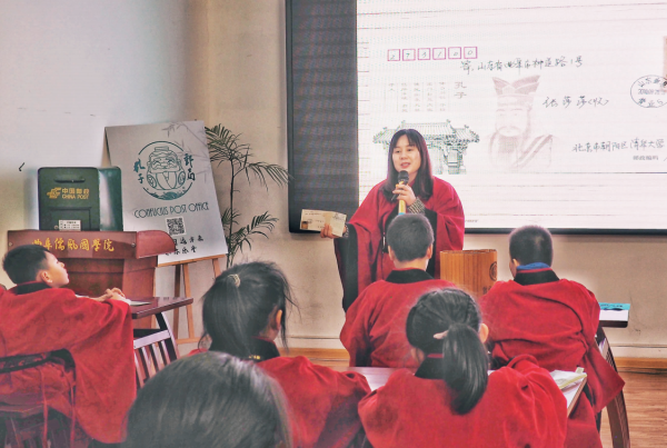 在此次活动中,孔子邮局特色课程——《邮票上的儒家文化》首次开讲,集邮知识、三孔风景、儒家思想都以邮票为载体呈现在孩子们眼前,使孩子们通过特殊的方式领略了传统文化风采。同时,孔子邮局在儒风国学院设立了临时邮局,现场对孩子们进行明信片书写教学,结合儒家思想中的“孝”文化,让孩子们对父母、老师写下感恩之言,体验投递过程,以一张明信片结束研学游之旅。活动后,孔子邮局将《致家长的一封信》发放给研学游带队老师,再由带队老师转交给家长。家长扫码关注孔子邮局公众号后,留下学生姓名和收货地址,孔子邮局会把研学游途中的精彩瞬间以照片的形式寄给家长,使家长与孩子共享研学欢乐时光,形成线上线下联动效应。