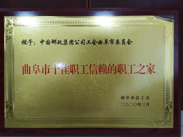 近日,曲阜市邮政分公司工会获得了市总工会颁发的“五一劳动奖状”“曲阜市十佳职工信赖的职工之家”荣誉奖牌,加之前期荣获的“工人先锋号”,该分公司包揽了市总工会2019年度全部集体荣誉。