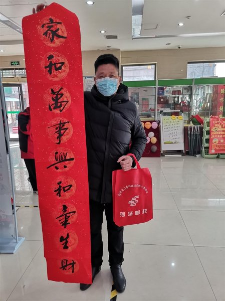 值新春佳节来临之际,为丰富广大群众的物质文化生活,回馈广大客户多年来对邮政的关心和支持,全力助推邮政业务发展,1月31日,东明县邮政分公司联合庄周书画院、县爱心义工协会在中心支局营业大厅举行“迎新春 写春联 送福字”大型公益活动。