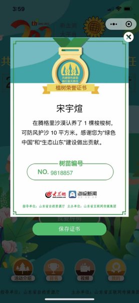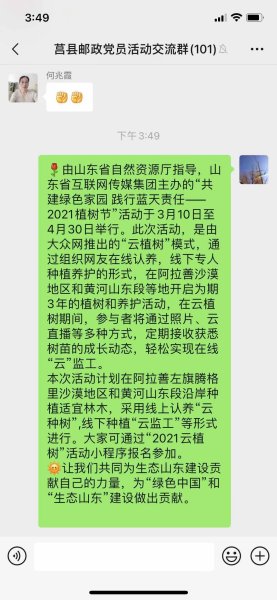 倡议活动发出以后,该分公司干部员工积极参与,纷纷变身“绿色使者”,为腾格里沙漠线上种植梭梭树、为黄河山东段线上种植紫穗槐,开启专属于自己的“云植树”。截至3月15时8时,莒县邮政员工通过“2021云植树”小程序认捐了10棵小树苗,认捐数量还在不断增加。