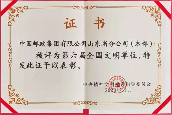 在中央文明建设指导委员会组织的第六届全国文明单位评选工作中,山东省分公司(本部)被授予“全国文明单位”荣誉称号。近年来,省分公司始终把创建全国文明单位作为长期性和系统性工程来抓,文明创建工作取得明显成效。