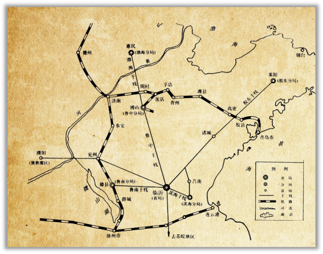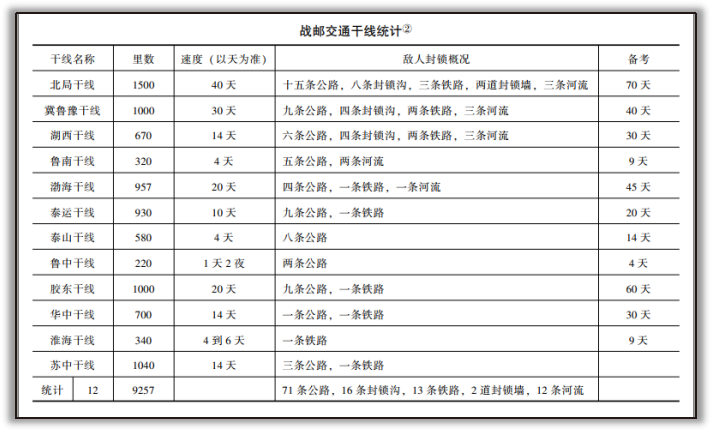 据1944年8月统计,先后建立了通往鲁南、渤海、鲁中、胶东、湖西、冀鲁豫、华中、苏中、太行和党中央延安等12条邮务交通干线,邮路总长度17200华里。