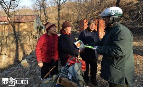 董乃军负责200多个投递点,他每天需要带着近百十斤重的邮包,翻越十几座山头为村民投递,38年的时间已经丈量了一百多万公里的山路,骑坏了十几辆自行车,但从没有因为天气原因或自己的疏忽懈怠而耽误任何邮件的投递,实现了38年无差错。图为董乃军从村里离开时,老人们和他挥手告别。