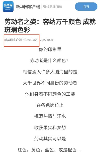 5月1日劳动节新华网报道“劳动者之姿”阅读量突破200万