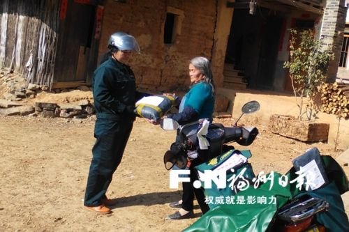 闽清县上莲乡的高山上,一座简陋的土墙瓦房前驶来一辆摩托车,身穿绿色工服的女邮递员支好车,将一个包裹递给住在这里的一位老奶奶。包裹里,是老奶奶的晚辈为她网购的日用品。