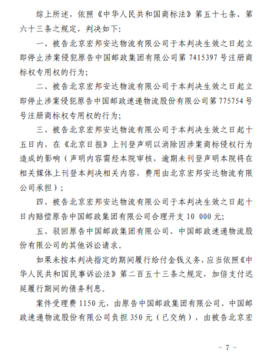 ”“中国邮政”商标构成近似,且涉案商标使用在物流运输服务上,对于公众而言容易导致对服务来源的误认或认为经营者之间具有许可使用、关联企业等特定关系,遂判令被告立即停止侵权行为、在《北京日报》上公开赔礼道歉并赔偿中国邮政1万元合理开支。