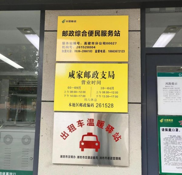 7月26日,潍坊市邮政公司、市交通运输局、市文明办、市邮政管理局联合举行“出租车温暖驿站”揭牌仪式。“出租车温暖驿站”由潍坊市文明办、潍坊市交通运输局、潍坊市邮政管理局和中国邮政集团有限公司潍坊市分公司共同设立,充分发挥了邮政公司营业网点遍布城乡、服务面广的独特优势,将有效解决全市出租车驾驶员休息难、如厕难、喝水难、热饭难等问题,促进出租车行业健康发展,优化出租车驾驶员的工作环境。