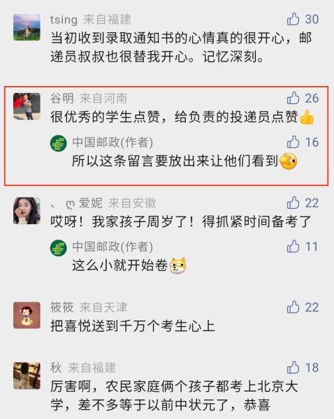 看到一封封装着高考录取通知书的特快专递被打开,看到考生以及家长们脸上挂着的笑容,这是邮政人最开心的时刻:看到你幸福的样子,于是幸福着你的幸福,快乐着你的快乐。