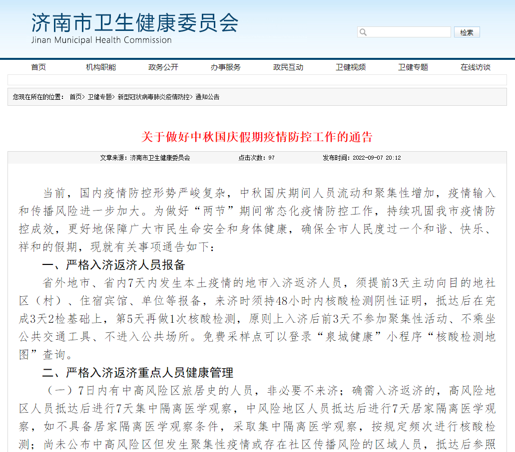 省外地市、省内7天内发生本土疫情的地市入济返济人员,须提前3天主动向目的地社区(村)、住宿宾馆、单位等报备,来济时须持48小时内核酸检测阴性证明,抵达后在完成3天2检基础上,第5天再做1次核酸检测,原则上入济后前3天不参加聚集性活动、不乘坐公共交通工具、不进入公共场所。免费采样点可以登录“泉城健康”小程序“核酸检测地图”查询。