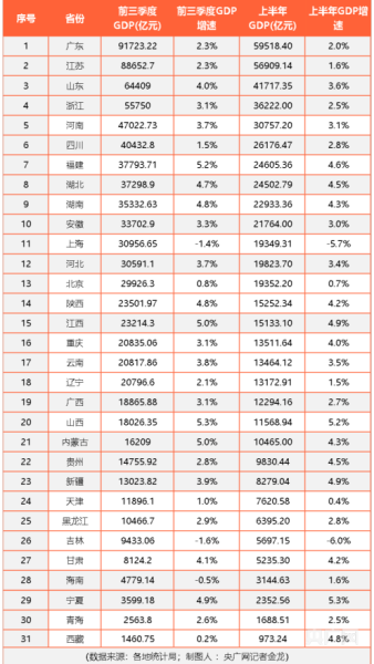 值得注意的是,在这31个省市中,有21个省市前三季度经济增速相比上半年有所上升,显示三季度经济恢复向好态势。尤其是全国经济总量排名前10的经济大省,基本上前三季度增速都比上半年加快。