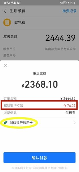 2.本活动仅限支付宝合作采暖缴费单位,非支付宝提供缴费单位不参与本次活动。支付时支付宝并选择邮储信用卡为扣款卡可享受优惠。