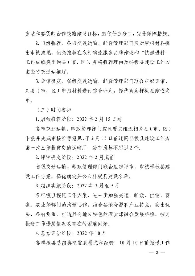 3.评审确定。省级交通运输、邮政管理部门联合组织评审, 对县(市、区)申报材料进行综合评定,择优确定样板县建设名单。