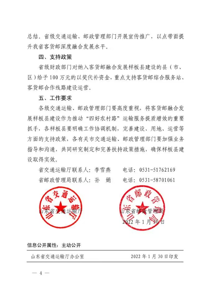 根据《山东省人民政府关于印发 2022 年“稳中求进”高质量发展政策清单(第一批)的通知》(鲁政发〔2021〕23 号),2022 年省交通运输厅、省邮政管理局联合开展农村客货邮融合发展样板县建设,现将有关事项通知如下: