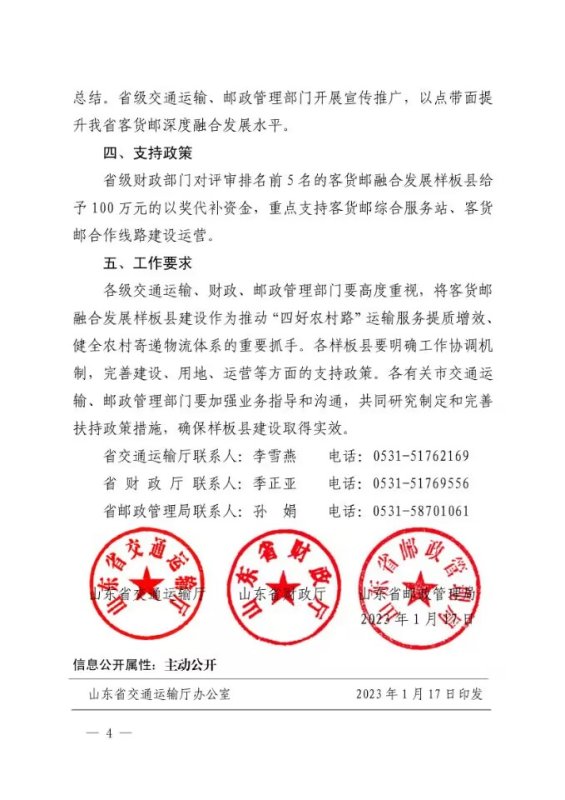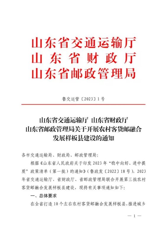 根据《山东省人民政府关于印发 2023 年“稳中向好、进中提质”政策清单(第一批)的通知》(鲁政发〔2022〕18 号),2023年省交通运输厅、省财政厅、省邮政管理局联合开展第三批农村客货邮融合发展样板县建设,现将有关事项通知如下: