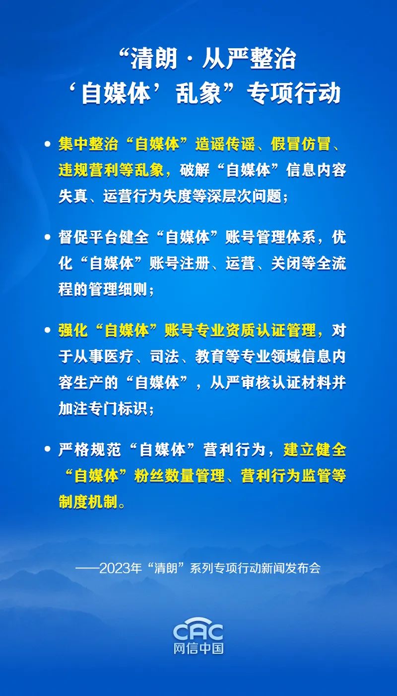 此次专项行动,我们重拳整治“自媒体”造谣传谣、恶意炒作、假冒仿冒、违规营利等突出问题,并力争取得立竿见影的成效。在“猛药去疴”基础上我们将着眼长远、立足长效,探索建立常态化管理机制,努力铲除“自媒体”乱象滋生土壤。