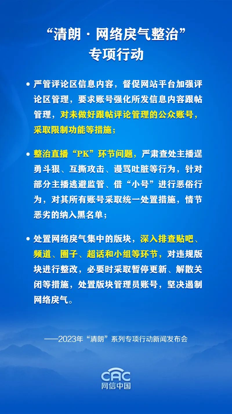 国家网信办有关负责人在发布会上介绍,2023年“清朗”系列专项行动,将以“推动形成良好网络生态”为工作目标,聚焦9方面新情况新问题和难点瓶颈,具体包括:从严整治“自媒体”乱象;打击网络水军操纵信息内容;规范重点流量环节网络传播秩序;优化营商网络环境,保护企业合法权益;生活服务类平台信息内容整治;整治短视频信息内容导向不良问题;2023年暑期未成年人网络环境整治;网络戾气整治;2023年春节网络环境整治。