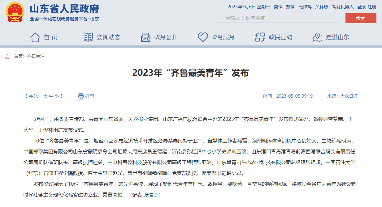 5月4日,由省委宣传部、共青团山东省委、大众报业集团、山东广播电视台联合主办的2023年“齐鲁最美青年”发布仪式举办。省领导曾赞荣、王艺华、王修林出席发布仪式。