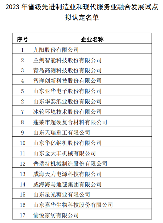 山东省2023年省级先进制造业和现代服务业融合发展试点拟认定名单公示
