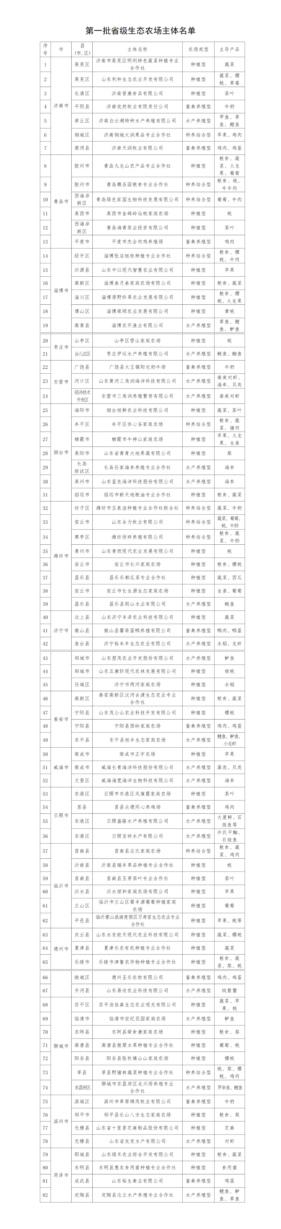 根据《山东省推进生态农场建设工作实施意见》《山东省省级生态农场评价认定管理办法(试行)》要求,省农业农村厅组织开展了第一批省级生态农场评价工作。通过主体自愿申报、县级审查推荐、市级审核评价、省级复核审议、结果公示等程序,确定授予82家主体省级生态农场称号,现予以公布,名单如下: