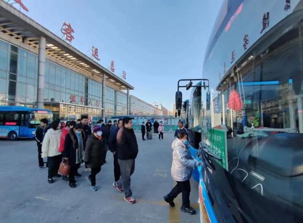 乘客在乐陵市客运总站乘坐公交车。(乐陵市交通运输局供图)