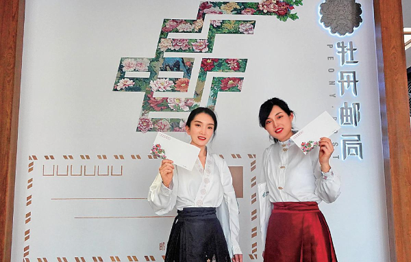 穿汉服、赏牡丹成为牡丹邮局打卡潮流。