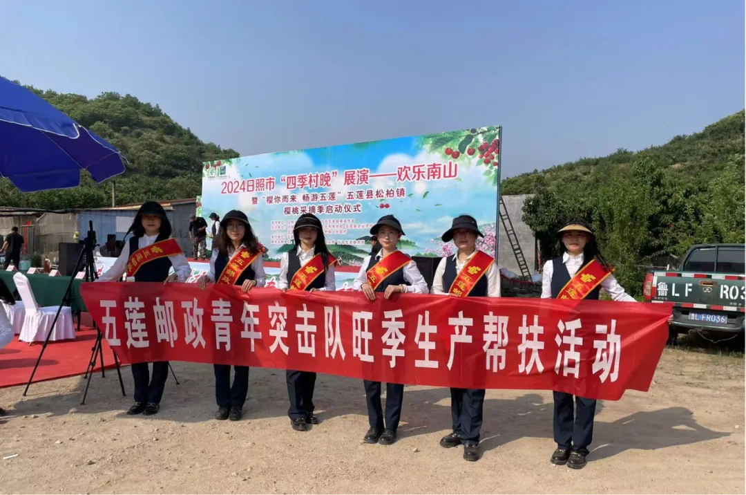 日照市分公司启动了“樱你而来 畅游五莲”五莲县松柏镇樱桃采摘季仪式,市、县两级直播团队把直播场地设置在樱桃林里,以“不辞辛苦出山林”的实干精神,紧密协作、轮番上阵开展助农直播,向观众推介五莲大樱桃,帮助农民解决农产品“销售难”的问题。樱桃收寄市场上也穿梭着邮政青年突击队忙碌奔波的身影,挑拣、封装、搬运,为果农提供最大程度的便利服务。