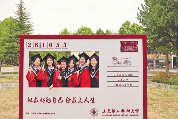 潍坊邮政以其特有的方式,陪伴毕业生度过美好大学时光的最后一程:再与学校的一楼一墙合个影,再在学校的一草一木前打个卡,为大学时光画上圆满的句号。图为毕业生在信封式打卡墙下合影留念。
