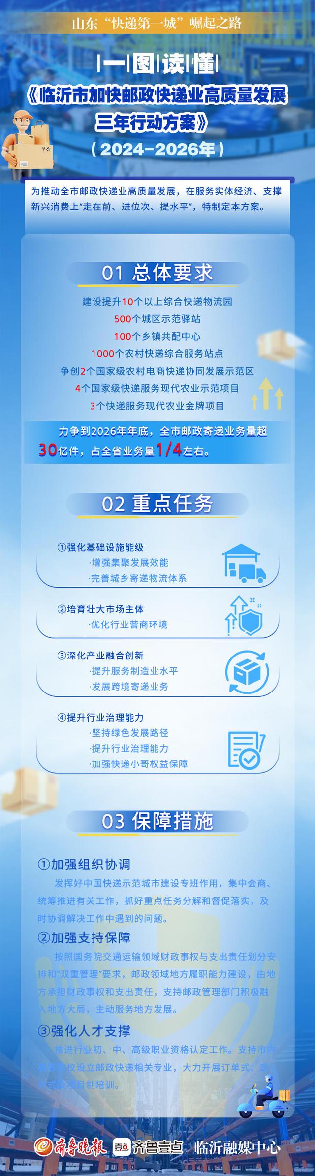 近日,临沂市政府办公室印发《临沂市加快邮政快递业高质量发展三年行动方案(2024—2026年)》,力争到2026年年底,全市邮政寄递业务量超30亿件,占全省业务量1/4左右。