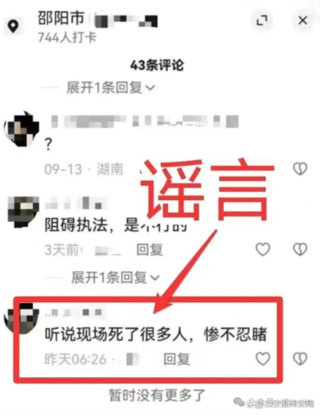 经查,黎某因在平台上看到有执法现场视频,便使用自己的社交账号在视频评论区造谣“现场死了很多人,惨不忍睹”,引发大量网民关注和当地居民恐慌,造成不良社会影响。目前,绥宁公安已依法对黎某作出行政处罚。