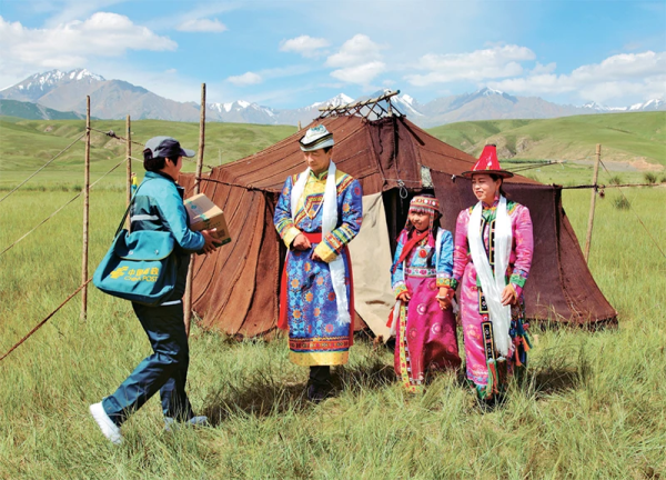 农村快递网络已成为农产品出村进城、消费品下乡进村的主渠道和特色农产品从田间地头直连百姓餐桌的大通道,有力地促进了城乡资源要素流动,逐步缩小了城乡居民消费模式和服务体验的差距。图为2024年5月10日,甘肃省张掖市邮政分公司投递员正在为一个裕固族家庭送包裹。 国家邮政局供图 张同勇/摄