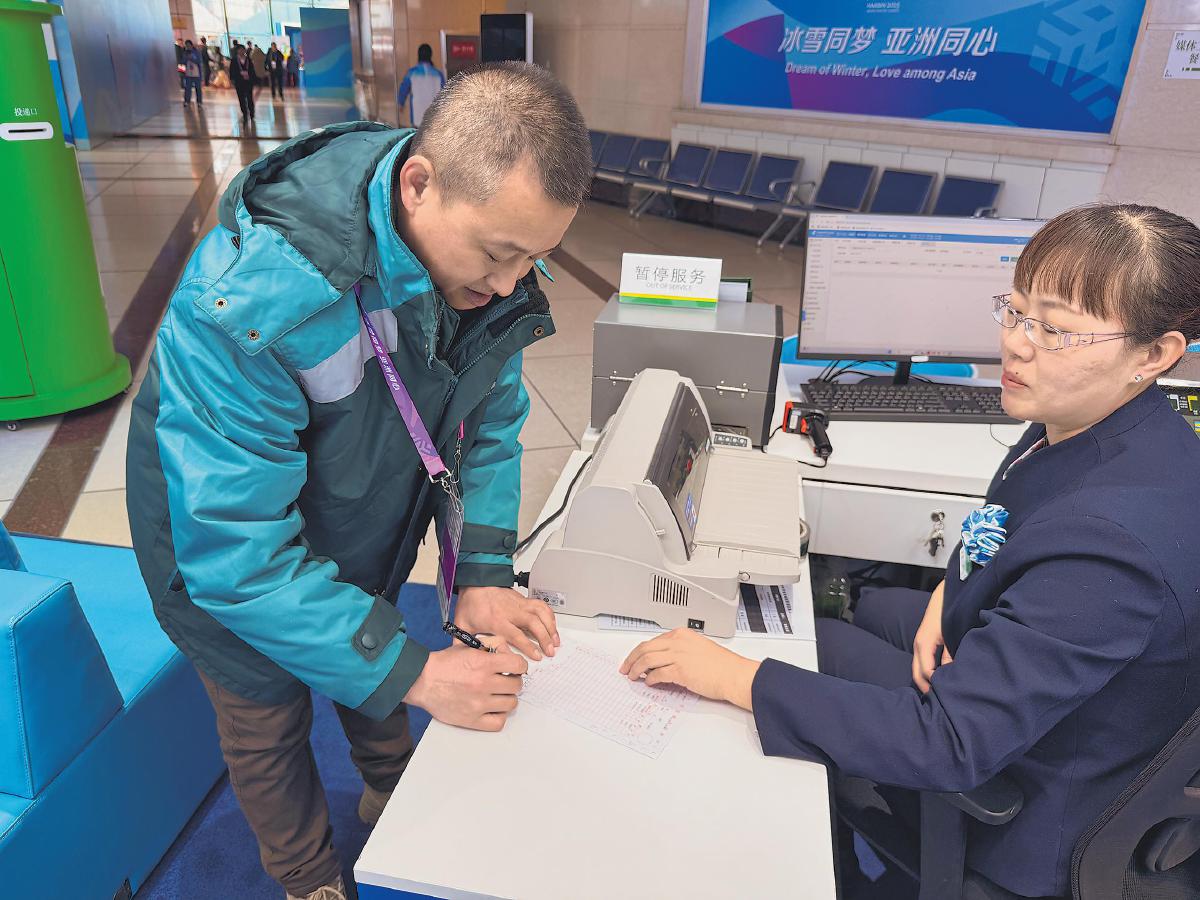 自2月1日起,为服务好第九届亚冬会,黑龙江省哈尔滨市邮政分公司精心组织、周密部署,抽调10名投递人员、10辆邮车,细致规划投递段道,全面承担起亚冬会比赛场所进口邮件投递和3个主题邮局出口邮件归集工作,确保每日投递频次,邮政服务不间断。图为投递人员在主题邮局交接邮件。