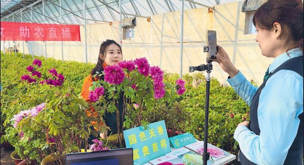 邮政员工在种植大棚内为菏泽牡丹直播带货