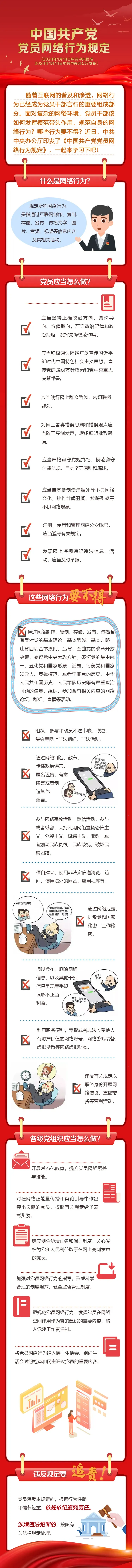 《中国共产党党员网络行为规定》于2024年1月14日经党中央批准、办公厅发布后同日施行,它是第一部规范党员网络行为的党内法规,是全体党员使用网络的根本遵循,共计5章31条。