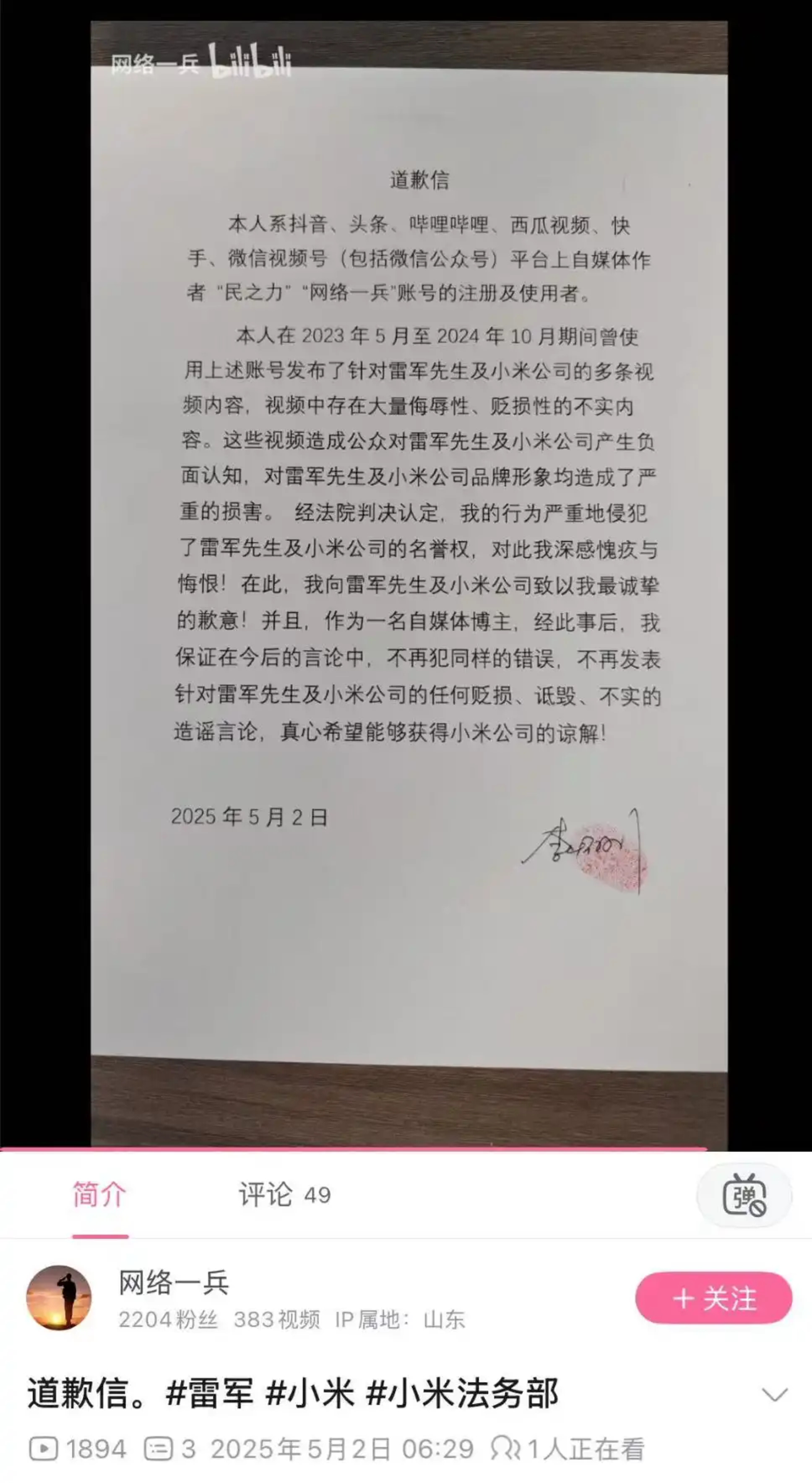 北京日报记者查询发现,“网络一兵”已于5月2日在哔哩哔哩上发布对雷军及小米公司的道歉信。