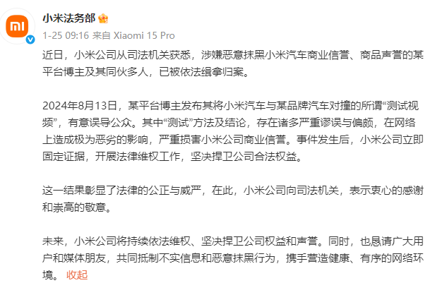 2024年8月13日,某平台博主发布其将小米汽车与某品牌汽车对撞的所谓“测试视频”,有意误导公众。其中“测试”方法及结论,存在诸多严重谬误与偏颇,在网络上造成极为恶劣的影响,严重损害小米公司商业信誉。2025年1月25日,@小米法务部 称,从司法机关获悉,涉嫌恶意抹黑小米汽车商业信誉、商品声誉的某平台博主及其同伙多人,已被依法缉拿归案。