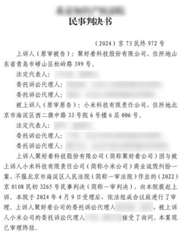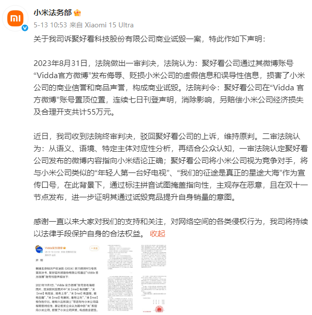 此前,聚好看公司通过其微博账号“Vidda官方微博”发布侮辱、贬损小米公司的虚假信息和误导性信息,损害了小米公司的商业信誉和商品声誉,构成商业诋毁。2023年8月31日,法院做出一审判决:聚好看公司在“Vidda官方微博”账号置顶位置,连续七日刊登声明,消除影响,另赔偿小米公司经济损失及合理开支共计55万元。随后,聚好看公司提起上诉。