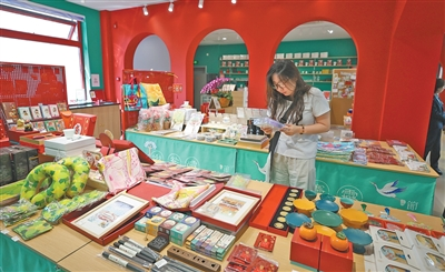 游客在北京地安门主题邮局选购文创产品。