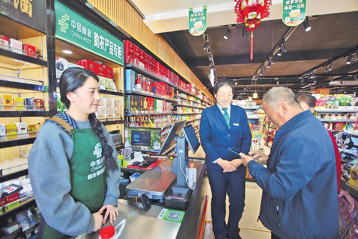 五原县邮政分公司在“双生态圈”打造中,携手县工业和信息化局,深度融入县域商业体系建设项目,争取政府补贴资金,选取全县11个乡镇的11处商超,全部升级改造为邮政标准化综合便民服务站点。采访组在银定图镇福多乐天天惠超市看到,面积达425平方米的超市宽敞明亮、顾客盈门,货品琳琅满目,“天天3·15 放心邮乐购”的标志醒目,快递存放处摆满了待取的包裹。“环境好、人气旺,营收比改造前增加了近三成。”超市老板李浩喜笑颜开,特意将采访组领到新建的冷库。冷库里摆满了牛羊肉等生鲜产品,他说再也不用为存放问题发愁了,村民随时需要,自己随时有货。