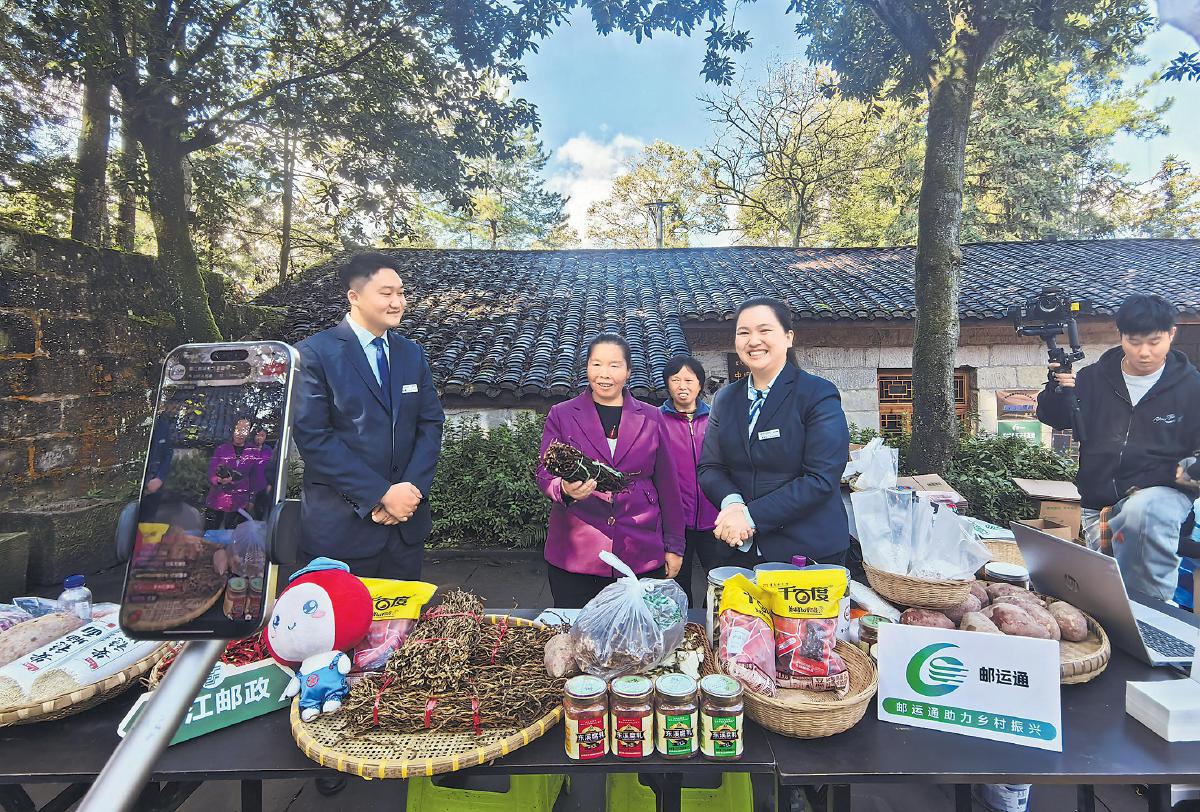 近日,在重庆市綦江区中坝村村委会的小院里,邮政工作人员与村民围在摆满干辣椒、干货、特色酱料的展台前,对着手机直播镜头热情推介当地好物。在全市推进“邮运通”工作的助力下,綦江区邮政分公司开通“邮车到我家”专线,并在今年4月联合区商务委构建“产地首发—冷链运输—终端配送”全链条服务体系,实现山乡特产“当日采收、次日达城”,为农村电商发展提供有力支撑。